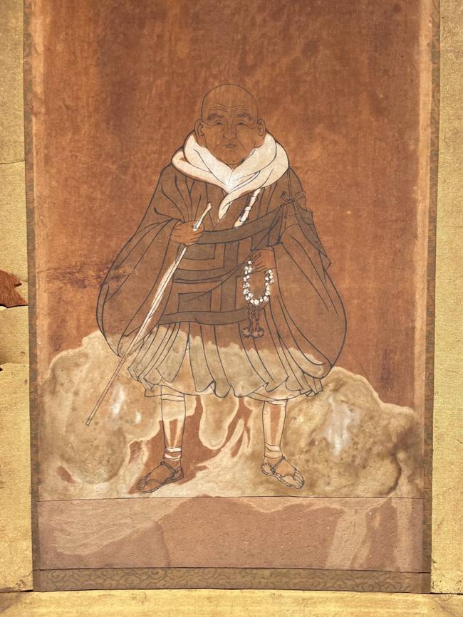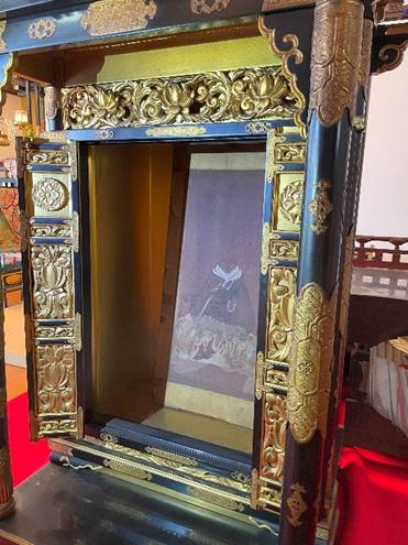 修復前の御影を厨子へ納めたところ C 御影の厨子 さて宝町の西光寺を訪ねたところ住職は次へ代が替わり、現在となっては安置されていた親鸞聖人の御影や版木の行方も知れず、また老朽化した脇檀(親鸞聖人の御影が安置されていたと思しき部分)の厨子(ずし:尊像を納める両扉の収納具)を新調して真言宗の形へ改める予定であるということから、隆照寺に旧来の厨子をお迎えする事となりました。 厨子の扉には浄土真宗に所縁の藤や牡丹の紋が施されており、宗旨を別異にしながらも親鸞聖人の故実をご在世の往時から大事に伝持なされた先達方のひとかたならぬ思いが偲ばれます。 D 御影の修復 この度の御影の修復は、北郷悟先生(東京藝術大学名誉教授)及び津田徹英先生(青山学院大学教授)の御指南を仰ぎ、装こう師の山口聰太郎氏へ依頼を致しました。この一歩を踏み出せたのは、御寄進を申し出て下さった御門徒懇志の賜物であります。思えば今年は親鸞聖人御誕生850年および立教開宗800年の節目であり、本願寺では慶讃法要が賑賑しく勤まりました。来る11月3日(文化の日)には、修復の進捗にもよりますが、望むらくは隆照寺の本堂へお帰り遊ばされます御影の尊前に報恩講を勤め、当寺と縁を結ばれました皆さまとのご対面がかないますよう強く念じるばかりです。 2023(令和5)年8月 住職拝 |